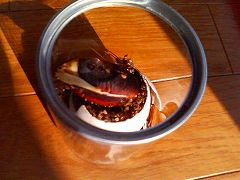 reach out, reach out 雲の上まで♪(少年ナイフ「Herbs]) 伸びろー、大きな豆ー。 友人のwedding partyでビンゴやって当たった「占い豆」です。巨大な大豆みたいな豆が卵の殻を破って、芽を出したっ! |