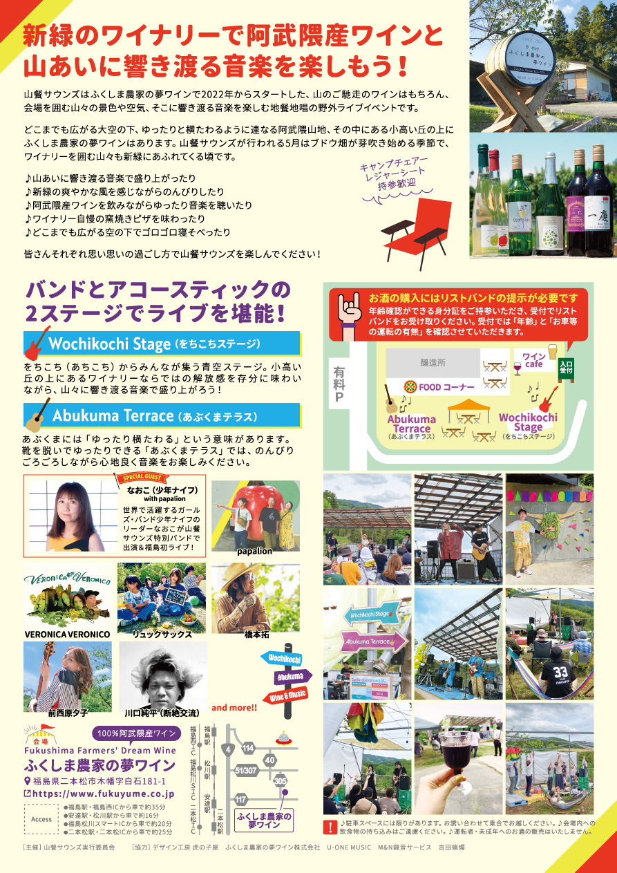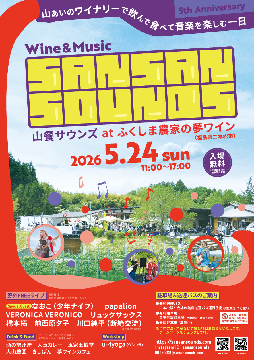 5月24日(日)、福島県二本松市ふくしま農家の夢ワインで開催されるイベント「山餐(さんさん)サウンズ」になおこの出演が決定しました。