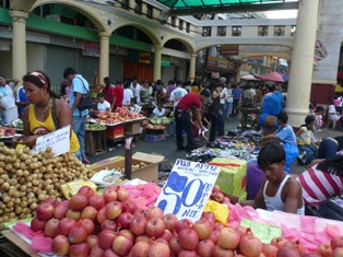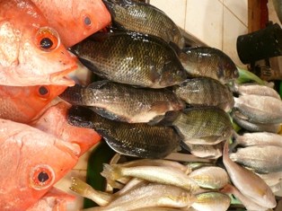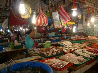 大きくて伊勢エビのようなシャコの一種、イカ、ラプラプ(赤い魚、クエ)、ティラピア(これだけ淡水魚、コイみたいなブラックバスみたいな見かけ)を魚屋さんでさばいてもらって、市場の2階のレストラン(食堂)の人に渡す、そして2階のレストランで調理してもらった魚を食べるというシステム。2階には食堂が数軒あって、1階の市場でそれぞれ客引きをしています。