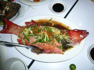 シャコはぷりぷりで、甘辛チリソースがかけてあっておいしかった。イカはあぶってあり、カラマンシーという酢橘(すだち)みたいなのをお醤油に絞ったものをつけて食べたら最高でした。ラプラプは蒸してあるのかな、新鮮でした。ティラピアは丸揚げにしてあって、皮はサクッサク、身はほっこりと大衆魚ということですが、上品な味わいでした。